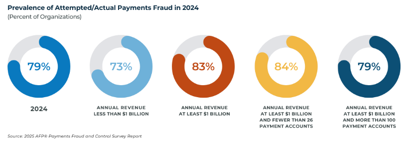 According to the 2025 AFP Payments Fraud and Control Survey, 79% of organizations reported being victims of attempted or actual payments fraud in 2024. That number has remained persistently high despite growing investments in compliance and controls.